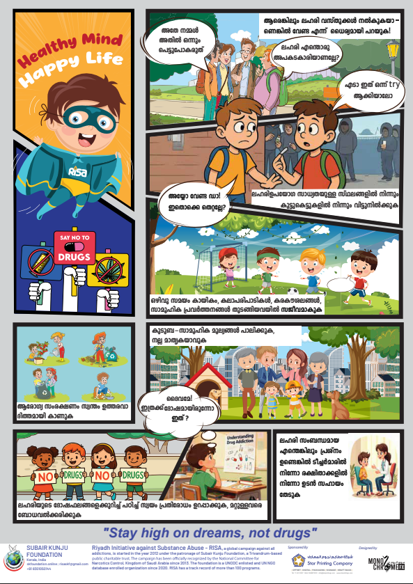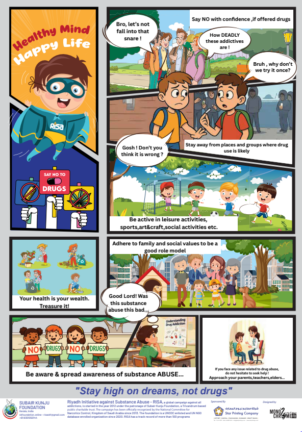 A multilingual comic flyer against substance abuse was released on the 14th of November, 2025 for awareness among students of grade 5 to 7. Initiated the first school level inauguration was done at International Indian School, Riyadh & the community level release was done on the 14th at a venue arranged by Kozhikkode Pravasi Association, Riyadh.